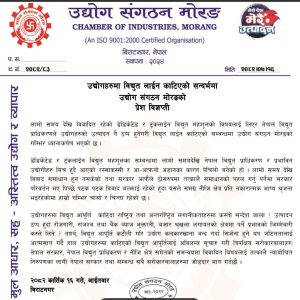 मोरङ उद्योग संगठनले नेपाल विद्युत् प्राधिकरण, नेपाल सरकार र निजी क्षेत्रबीच त्रिपक्षीय समन्वयमा तत्काल विवाद समाधान गरी उद्योगमा विद्युत् आपूर्ति पुनः सुचारु गर्न जोडदार माग गरेको छ। विज्ञप्तिमा भनिएको छ, “उद्योग–कलकारखाना बन्द हुँदा थप जटिलता सिर्जना हुन नदिन अहिले काटिएको विद्युत् आपूर्तिलाई अविलम्ब सञ्चालन गर्न आग्रह गर्दछौं।”