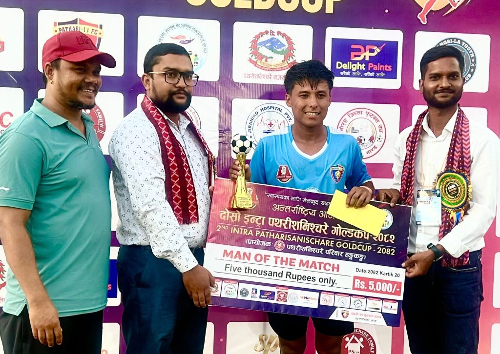 खेलको उत्कृष्ट प्रदर्शनका लागि सौर्य राउत ‘म्यान अफ द म्याच’ घोषित भए। उनलाई प्रमुख अतिथि तथा पथरी शनिश्चरे नगरपालिकाका प्रवक्ता नविनजंग कार्कीले ट्रफी र नगद पुरस्कार प्रदान गरे। खेल अवधिभर पथरी ११ ले कम्तीमा १२ वटा स्पष्ट गोल गर्ने अवसर गुमाए पनि निर्णायक गोलले जित सुनिश्चित गरेको थियो। एनआरटीका खेलाडीहरूले पनि राम्रो प्रयास गरे तर भाग्यले साथ दिएन।