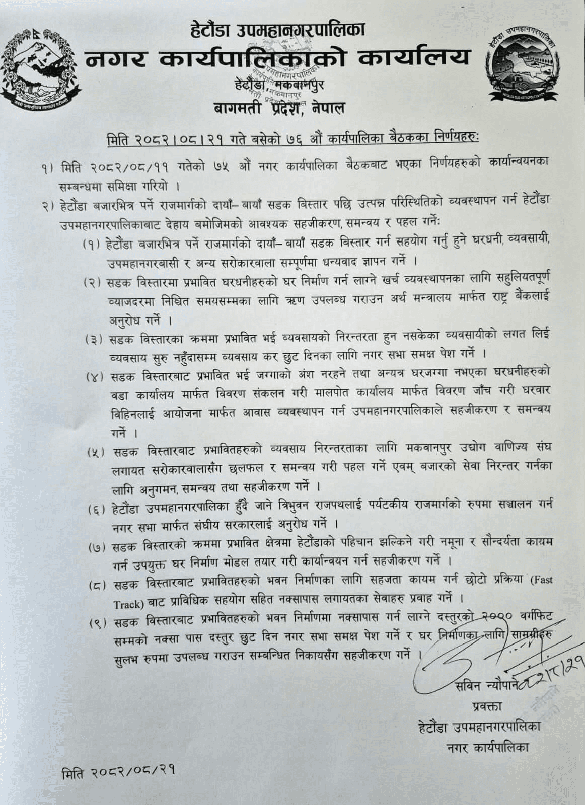 यसबाहेक, सडक विस्तारपछि निर्माण हुने संरचनालाई व्यवस्थित बनाउन हेटौंडाको पहिचान झल्किने ‘नमूना घर मोडल’ तयार गर्ने र सो मोडलअनुसार घर निर्माण गर्न सहजीकरण गर्ने निर्णय पनि बैठकले गरेको छ।