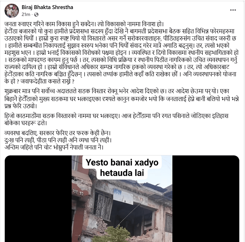 उनले थपे, “हाम्रो अनुरोध स्पष्ट थियो—पीडित र सरोकारवालासँग संवाद गरेर मात्रै अगाडि बढ्नुपर्छ। तर संवाद भएको महसुस भएन। काठमाडौँमा जस्तै हेटौँडामा पनि इतिहास बोकेका घरहरू ढले। सरकार बदलिँदा पनि जनताले भोग्ने पीडा उही छ; चोट अन्त्यमा सधैँ जनताले नै सहनुपर्छ।”