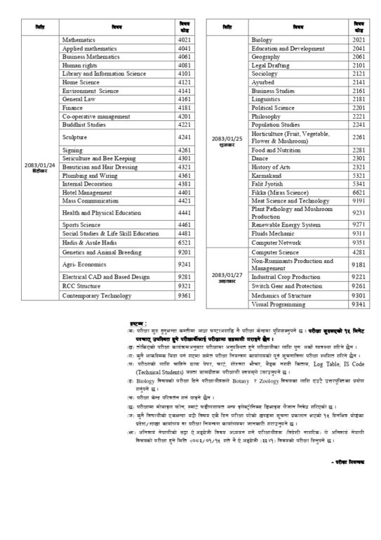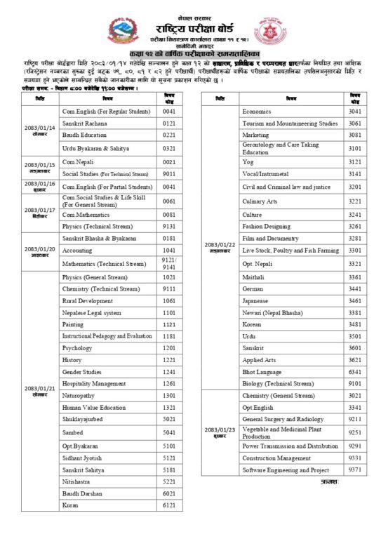 काठमाडौं।राष्ट्रिय परीक्षा बोर्डले कक्षा १२ को वार्षिक परीक्षाको समयतालिका जारी गरेको छ। यो परीक्षा बैशाख १४ गतेदेखि सञ्चालन हुने छ। साधारण, प्राविधिक र परम्परागत धारतर्फका नियमित परीक्षार्थीका साथै आंशिक (रजिस्ट्रेसन नम्बरका सुरुका दुई अंक ७९, ८०, ८१ र ८२ हुने) परीक्षार्थीहरूको लागि यो समयतालिका प्रकाशित गरिएको हो।