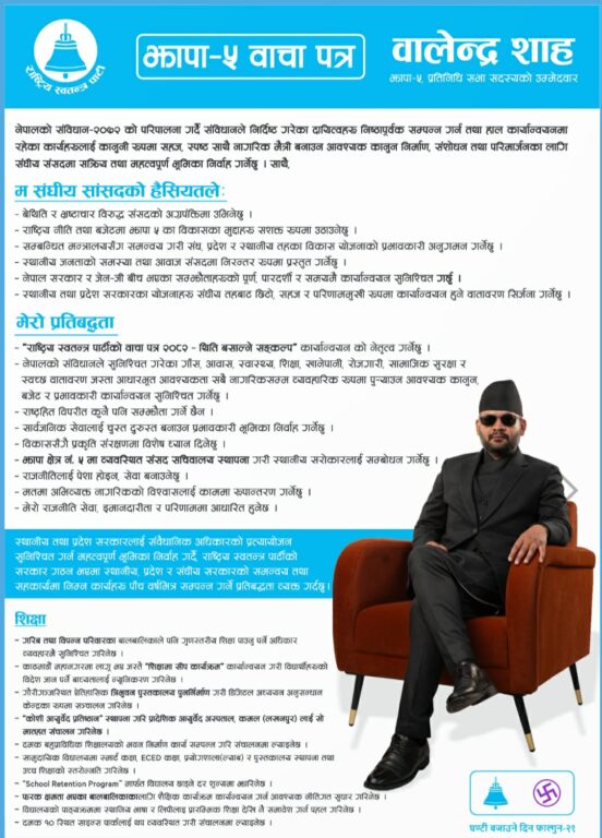 काठमाडौं। झापा निर्वाचन क्षेत्र नम्बर ५ बाट प्रतिनिधि सभा सदस्यको उम्मेदवार बनेका राष्ट्रिय स्वतन्त्र पार्टी (रास्वपा) का वरिष्ठ नेता बालेन्द्र साह बालेनले आज आफ्नो चुनावी वाचापत्र सार्वजनिक गरेका छन् । वाचापत्रमा आफ्नो निर्वाचन क्षेत्रका सुकुम्वासी समस्या समाधानका लागि काम गर्ने प्रतिबद्धता जनाएका उनले झापा ५ का भूमिहीन, सुकुम्वासी तथा अव्यवस्थित बसोबासीको दिगो समाधानका लागि आफ्नो नेतृत्वमा सरकार बनेको १०० दिनमा आयोग गठन गरी १००० दिनमा समाधान गर्ने नीति अपनाउने सङ्कल्प गरेका हुन् ।