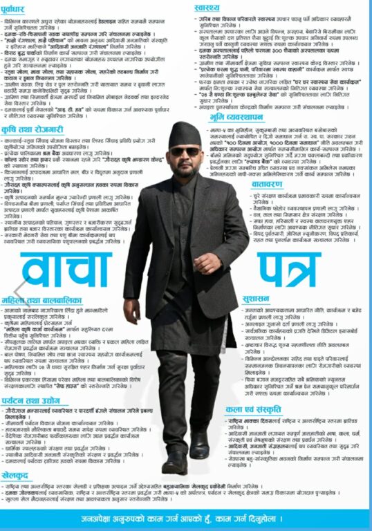 त्यस्तै, राष्ट्रहित विपरीत कुनै पनि सम्झौता नगर्ने, सार्वजनिक सेवालाई चुस्त दुरुस्त बनाउन प्रभावकारी भूमिका निर्वाह गर्ने, विकाससँगै प्रकृति संरक्षणमा विशेष ध्यान दिने वाचा गरेका छन् । त्यस्तै, राजनीतिलाई पेशा होइन, सेवा बनाउने, मतमा अभिव्यक्त नागरिकको विश्वासलाई काममा रुपान्तरण गर्ने वाचा गरेका छन् ।