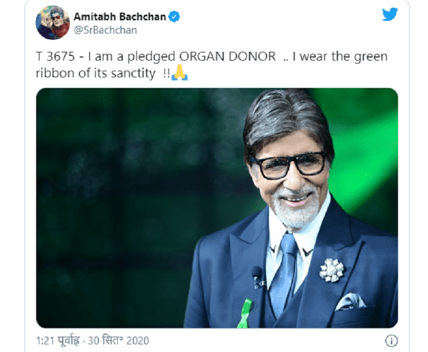 बलिउड अभिनेता अभिताभ बच्चनले आफ्ना अंगदान गरेका छन् । ७७ वर्षीय बच्चनले मंगलबार राती ट्वीटरमार्फत अंगदान गर्ने संकल्प लिएका हुन् । ट्वीटरमा उनले आफ्नो एक तस्बिर शेयर गरेका छन्, जसमा हरियो रङको रिबन लगाइएको छ । जुन रिबन अंगदानको संकल्पको प्रतिक हो । बच्चनले ट्वीटरमा लेखेका छन्ः ‘मैले अंगदान गर्ने प्रतिज्ञा गरेको छु, त्यसैले यसको शुद्धताका लागि हरियो रिबन पनि लगाएको छु ।’ सामाजिक सञ्जालमा उनको यो निर्णयको चौतर्फी रुपमा प्रशंसा गरिएको छ ।