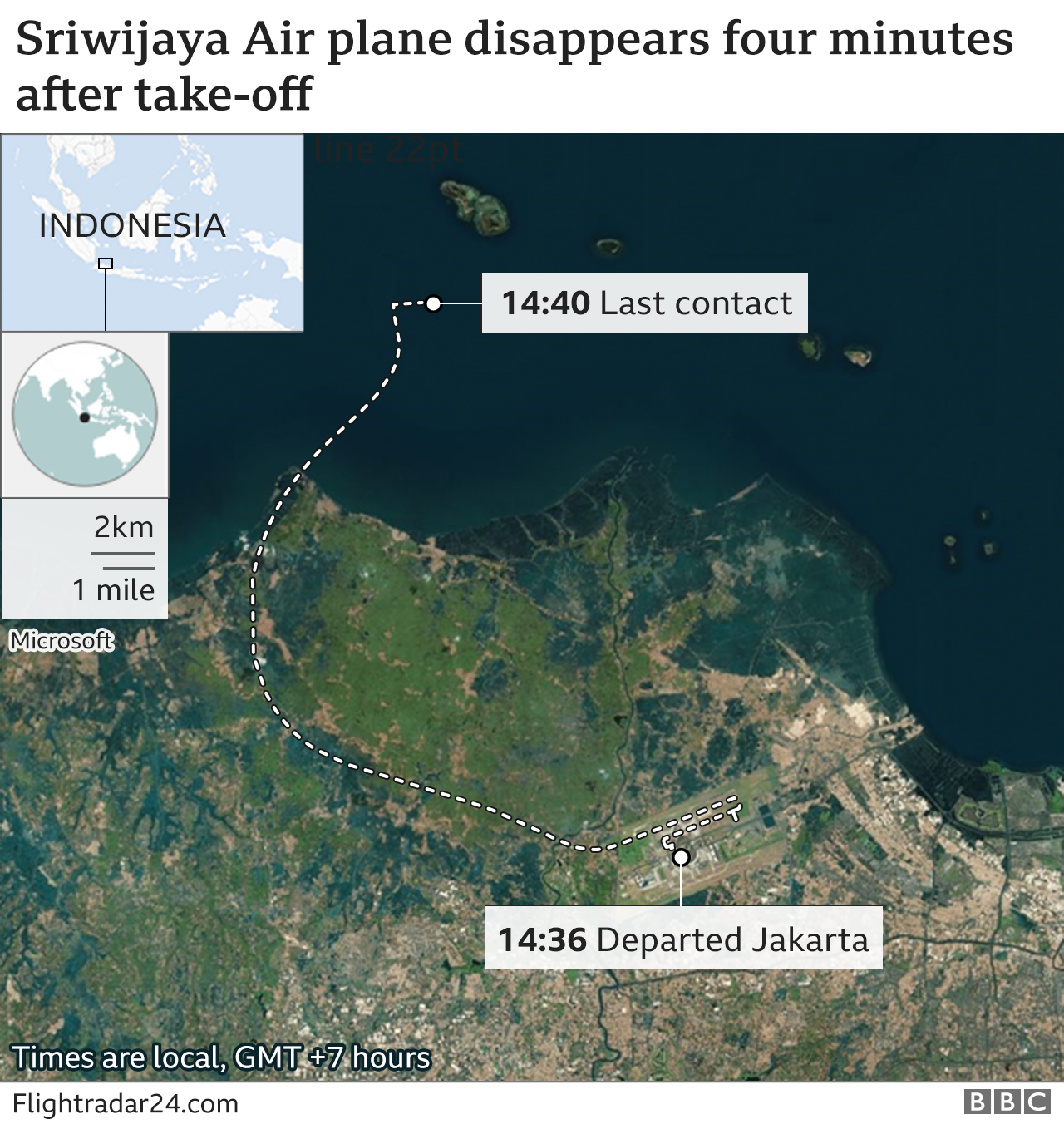 श्रीविजया एयरको यात्रुवाहक विमान जकार्ता विमानस्थलबाट स्थानीय समयअनुसार २ बजेर ३६ मिनेटमा उडान भरेको थियो । २ बजेर ४० मिनेटमा कलसाइन एसजेवाई१८२ कल साइन भएको विमानसँग अन्तिम पटक सम्पर्क भएको थियो । सम्पर्कविहीन हुनअघि विमानले कुनै समस्याको संकेत नगरेको नेसनर सर्च एन्ड रेस्क्यू एजेन्सीका एयर मार्सल बागुस पुरुहितो बताउँछन् ।