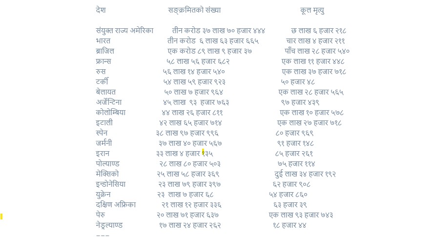 विश्वभर तीन अर्ब ३२ करोड ५५ लाख ६७ हजार १३२ डोज कोरोनाविरुद्ध खोप लगाइएको छ । सो विश्वविद्यालयले जुलाई ८ मा प्रकाशित गरेको विवरणअनुसार कोरोनाबाट अत्यन्त प्रभावित बीस देशका सङ्क्रमित र यस सङ्क्रमणबाट ज्यान गुमाएका नागरिकहरुको संख्या यसप्रकार रहेका छन् ।