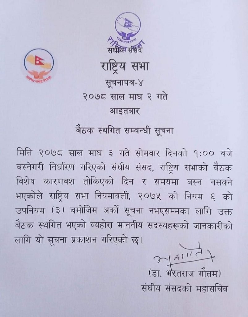 संघीय संसदका महासचिव डा.भरत गौतमले आइतबार सूचना जारी गर्दै माघ ३ गते सोमबार १ बजे बस्ने गरी निर्धारण गरिएको राष्ट्रियसभाको बैठक अर्को सूचना नभएसम्मका लागि स्थगित भएको जनाएका हुन् ।