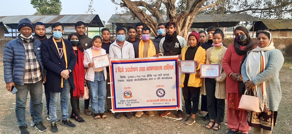 जहदा गाउँपालिका वडा न -३ को आर्थिक सहयोग तथा संचारकर्मी मिडिया प्रालि बिराटनगर -७ को आयोजनामा माघ १३ गतेदेखि १५ गतेसम्म तिन दिन उदघोषण तथा भाषण कला सम्बन्धि तालिम संचालन भएको थियो आज जहदा गाउँपालिका वडा -३ मा एक औपचारिक कार्यक्रमगरि सहभागी १८ जनालाई प्रमाणपत्र बितरण गर्दै तालिम समापन भएको छ ।
