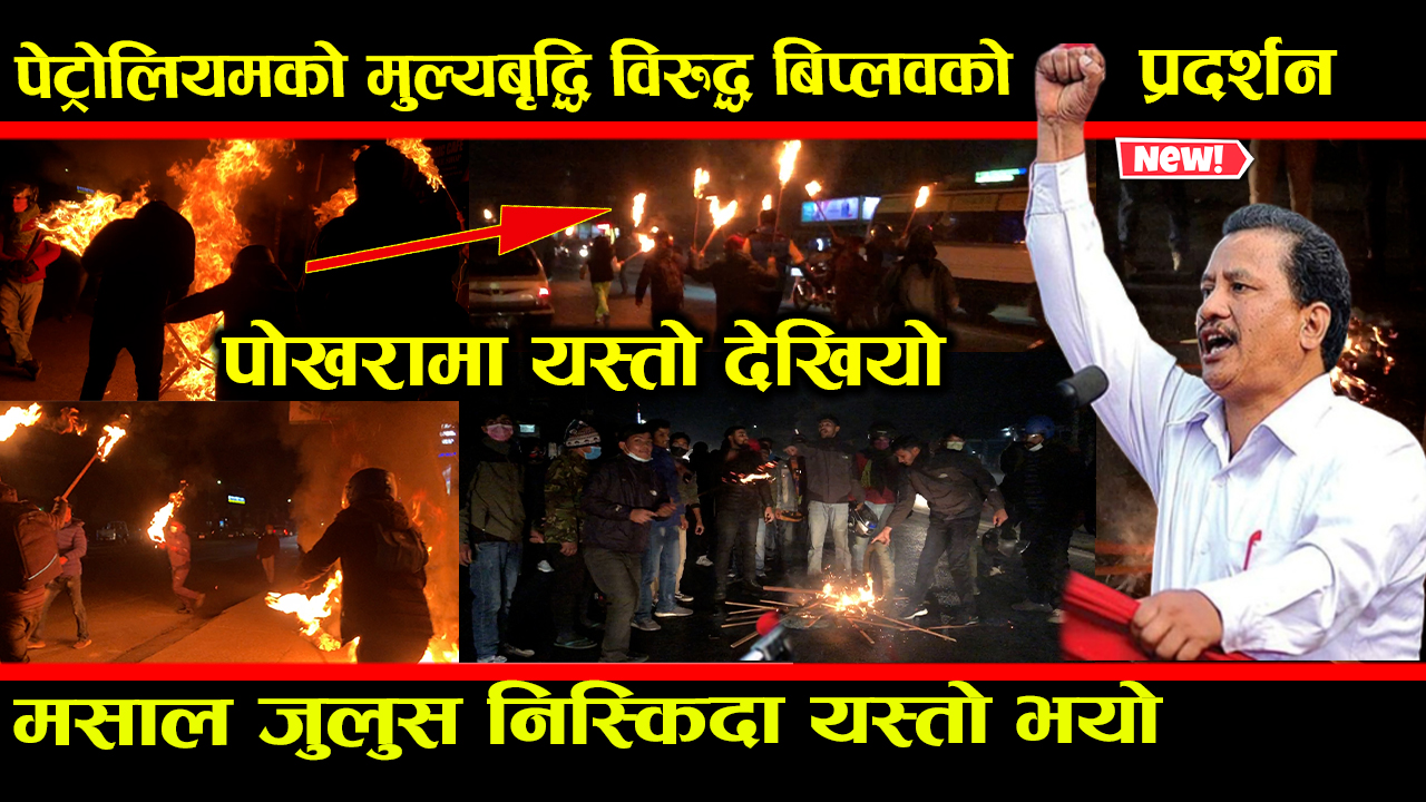 जनताको दैनिक जीवनसँग जोडिएका पेट्रोलियम तथा खाद्यवस्तुजस्ता अत्यावश्यक वस्तुमा सरकारले निरन्तर हुदै आएको मूल्य वृद्धिको विरुद्धमा पोखरामा नेपाल कम्युनिष्ट पार्टी “बिप्लव “ले मसाल जुलुस प्रदर्शन गरेका छन् ।