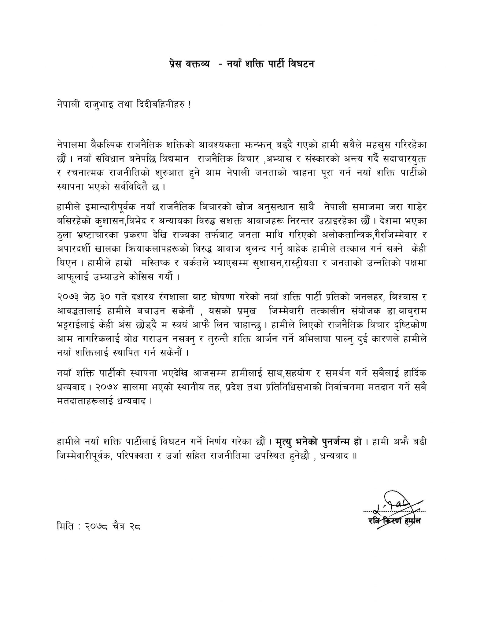‘हामीले नयाँ शक्ति पार्टीलाई विघटन गर्ने निर्णय गरेका छौं। मृत्यु भनेको पुनर्जन्म हो। हामी अझै बढी जिम्मेवारीपूर्वक, परिपक्कता र ऊर्जासहित राजनीतिमा उपस्थित हुनेछौं,’ रविकिरणले सोमबार पार्टी विघटन गरिएको भन्दै निकालेको प्रेस विज्ञप्तिमा उल्लेख छ।