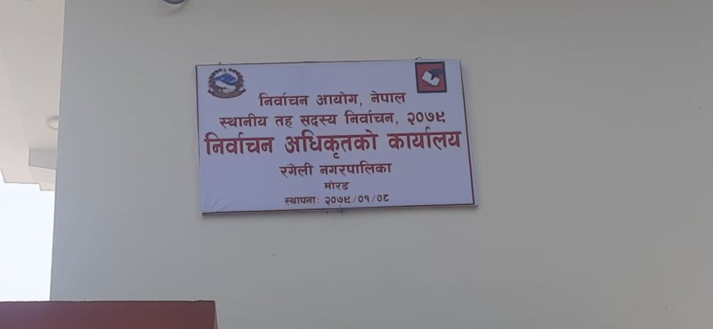 बैशाख ९ शुक्रबार ,रंगेली। रंगेली नगरपालिकामा निर्वाचन अधिकृतको कार्यालय स्थापना भएको छ । स्थानीय तहको निर्वाचनको स्थलगत तयारीका लागि बिहीबार निर्वाचन अधिकृतको कार्यालय स्थापना भएको छ ।